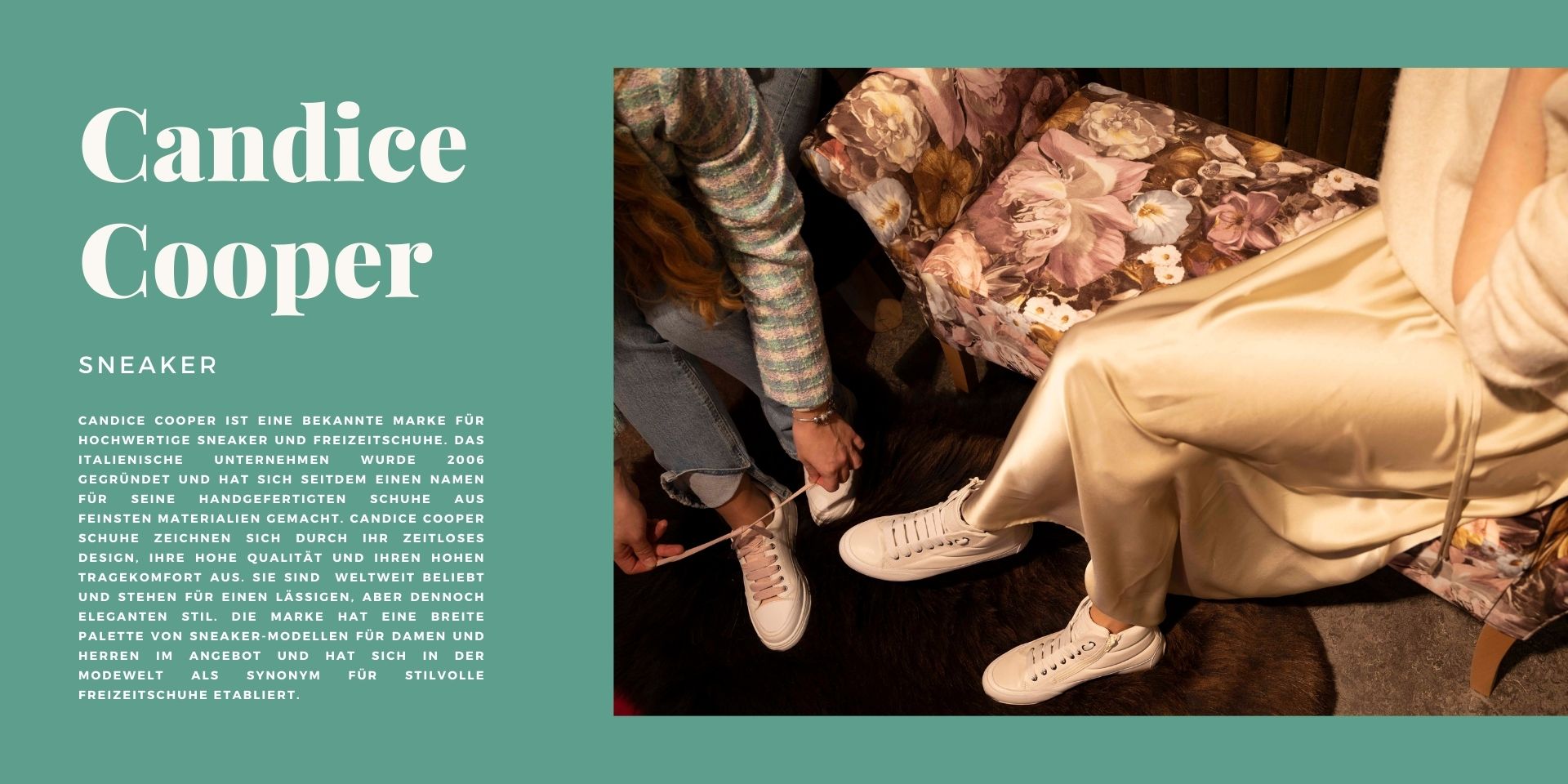 Candice Cooper, Teil der 1979 in München gegründeten deutschen Schuhmanufaktur Christoph Siegel, verbindet edles italienisches Leder mit trendigen Designs und hohem Tragekomfort. Die Vision der Marke ist es, sportliche und komfortable Schuhe aus hochwertigem Leder zu entwickeln, die sowohl Damen als auch Herren begeistern.
